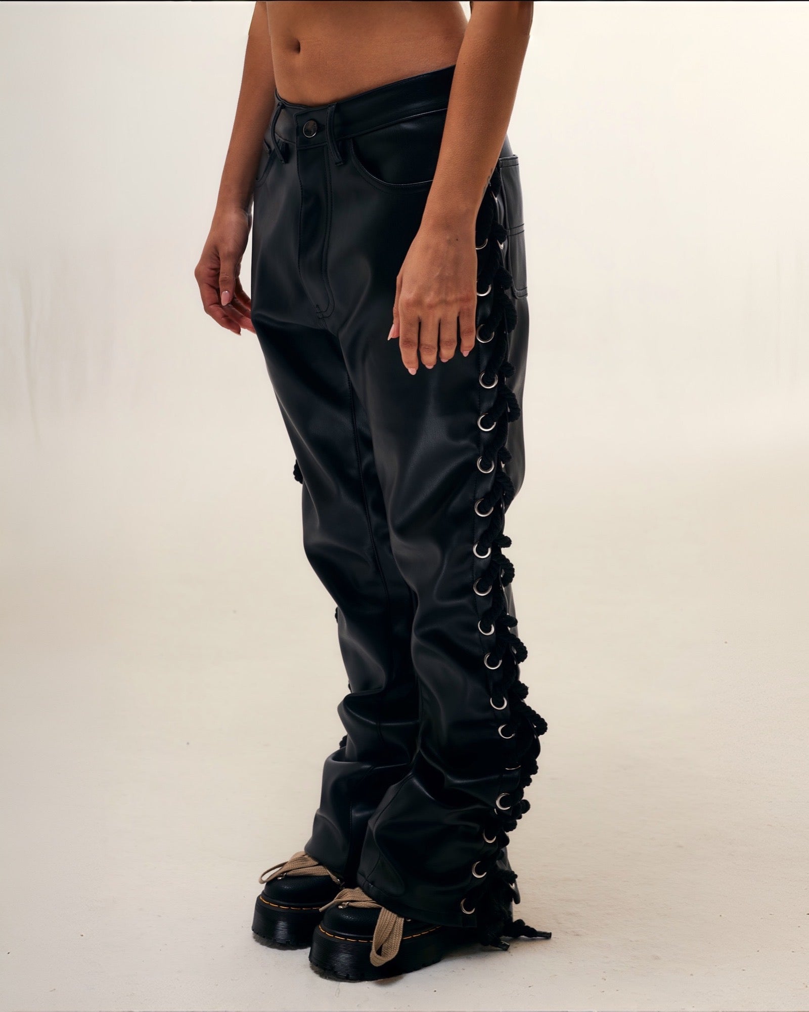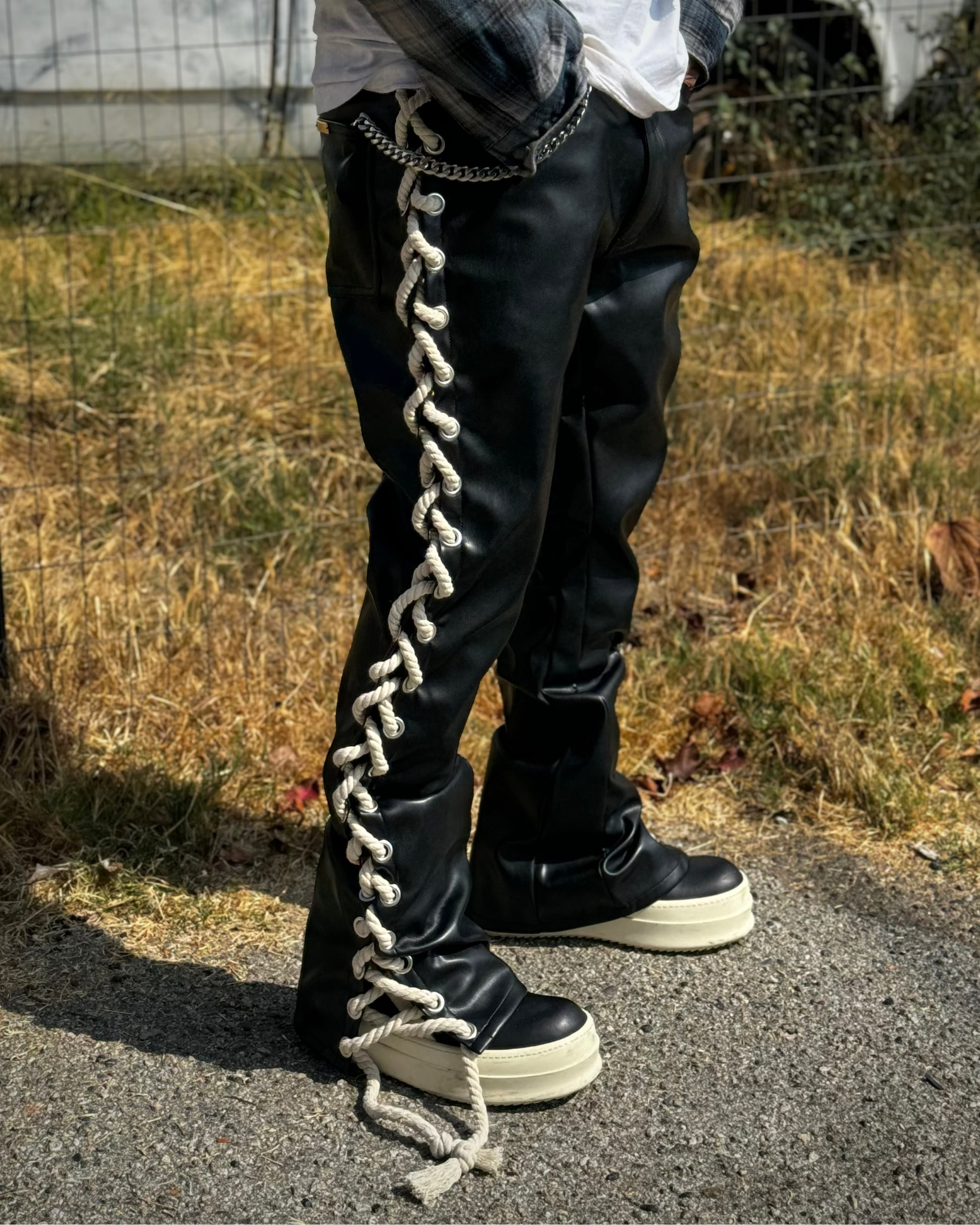 Rope Leather Pants are constructed from mid-weight vegan leather, designed to provide structure while maintaining comfort and mobility. Cut true to size with a mild flare, the silhouette stays clean through the leg while allowing subtle movement at the hem. Design details include a classic five-pocket layout, reinforced eyelet seams, and integrated 8mm rope bindings that add both function and visual tension.