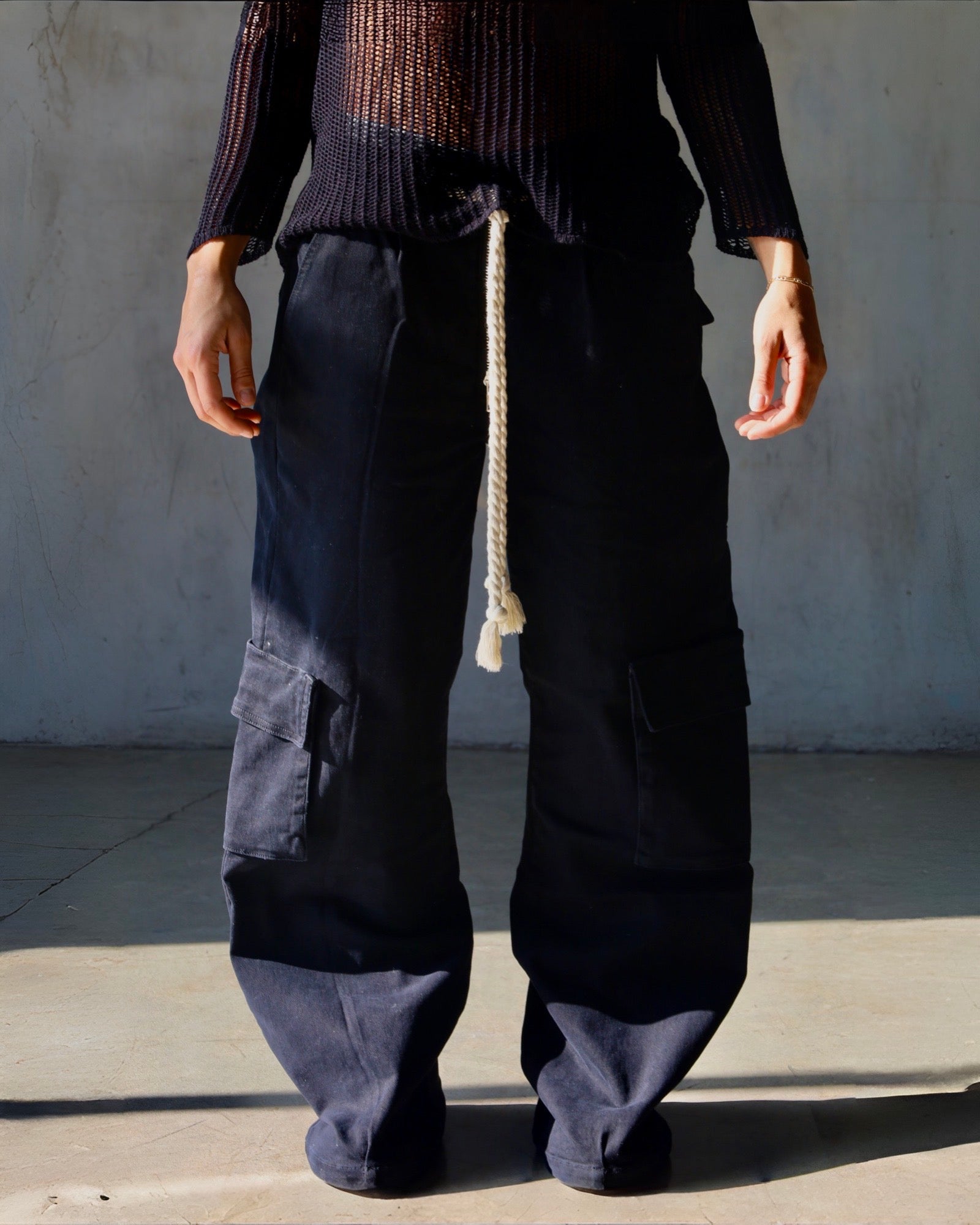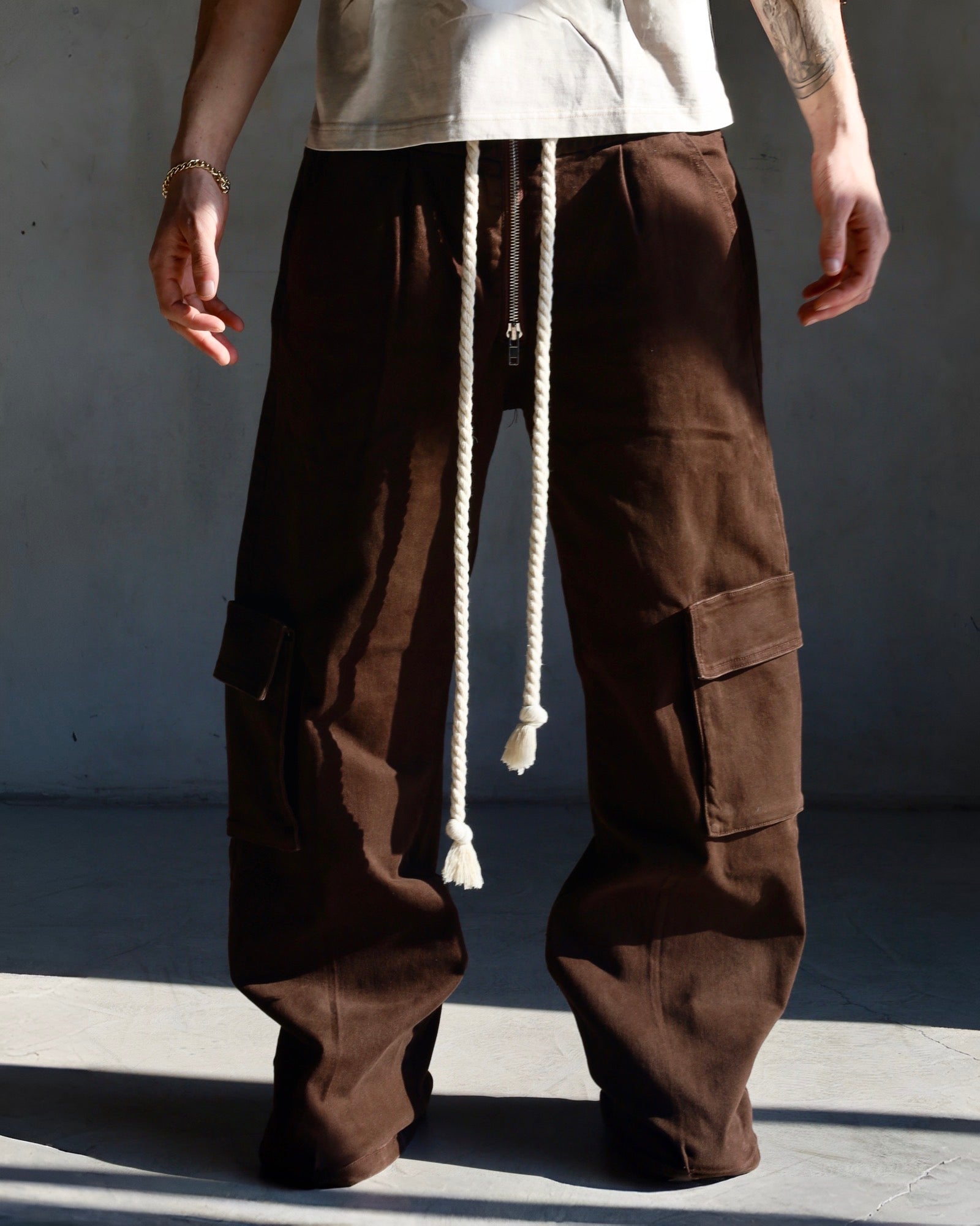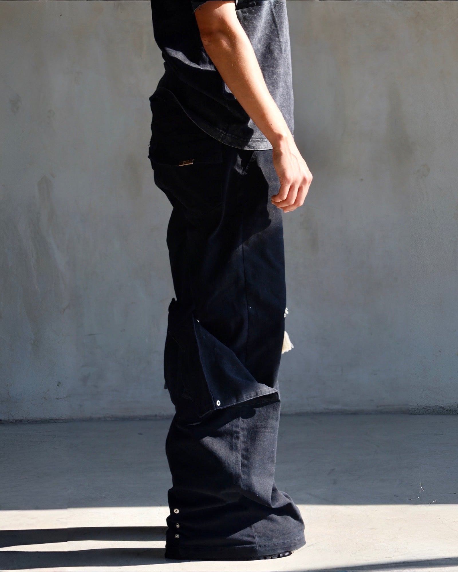 Nomad Cargo Pants are constructed from 360 GSM medium-weight cotton with slight stretch, offering structure with everyday mobility. Cut in a wide-leg silhouette with a subtle flare, the fit balances volume and movement while maintaining a clean line through the leg. Functional detailing includes removable button-snap cargo pockets, an elastic waistband with an 8mm rope drawstring, a chunky reverse zipper, and signature adjustable heel snaps designed to control heel drag based on footwear.
