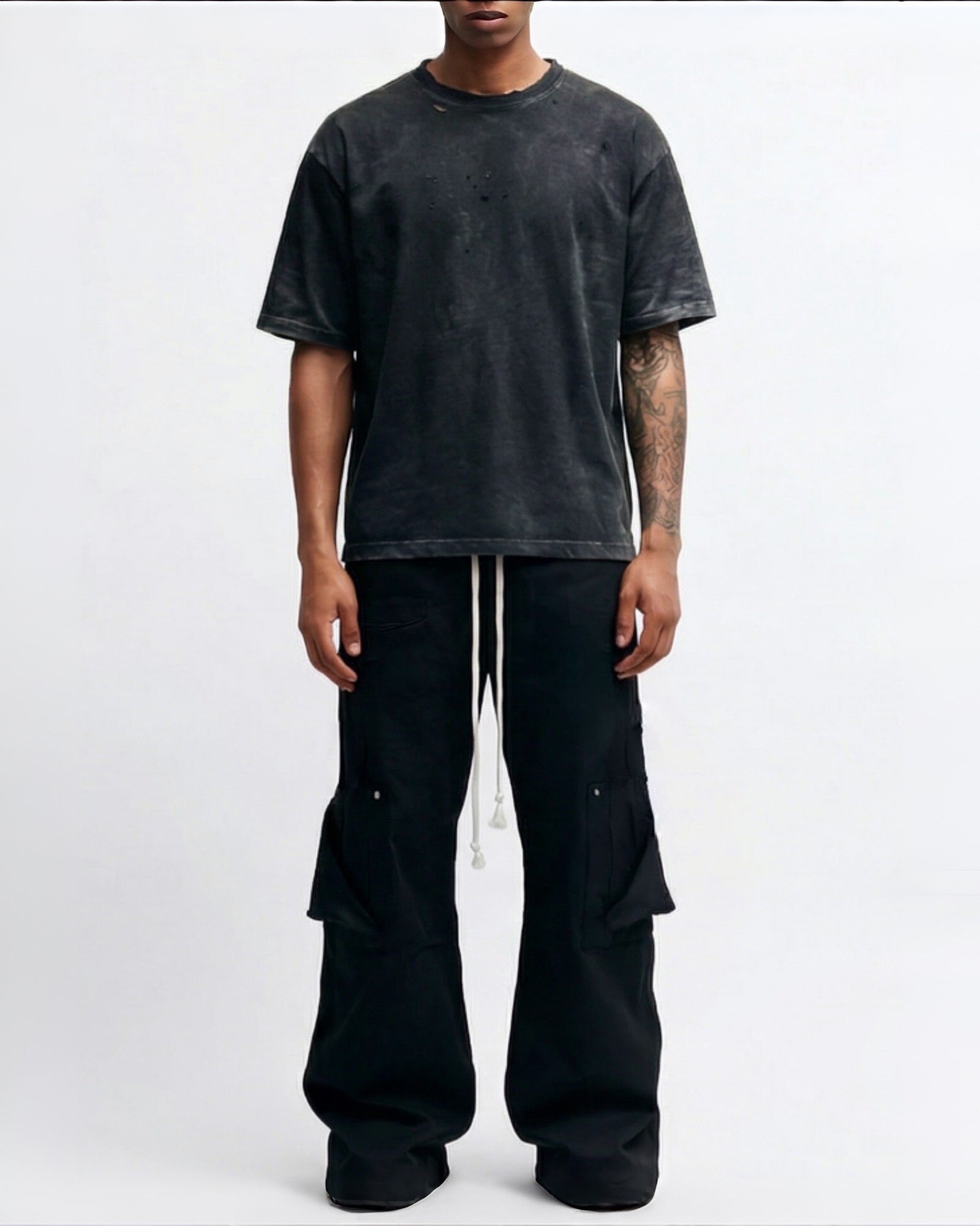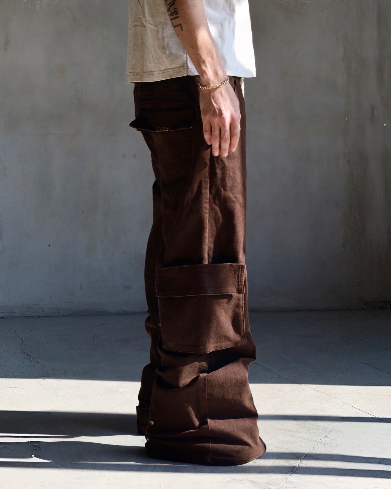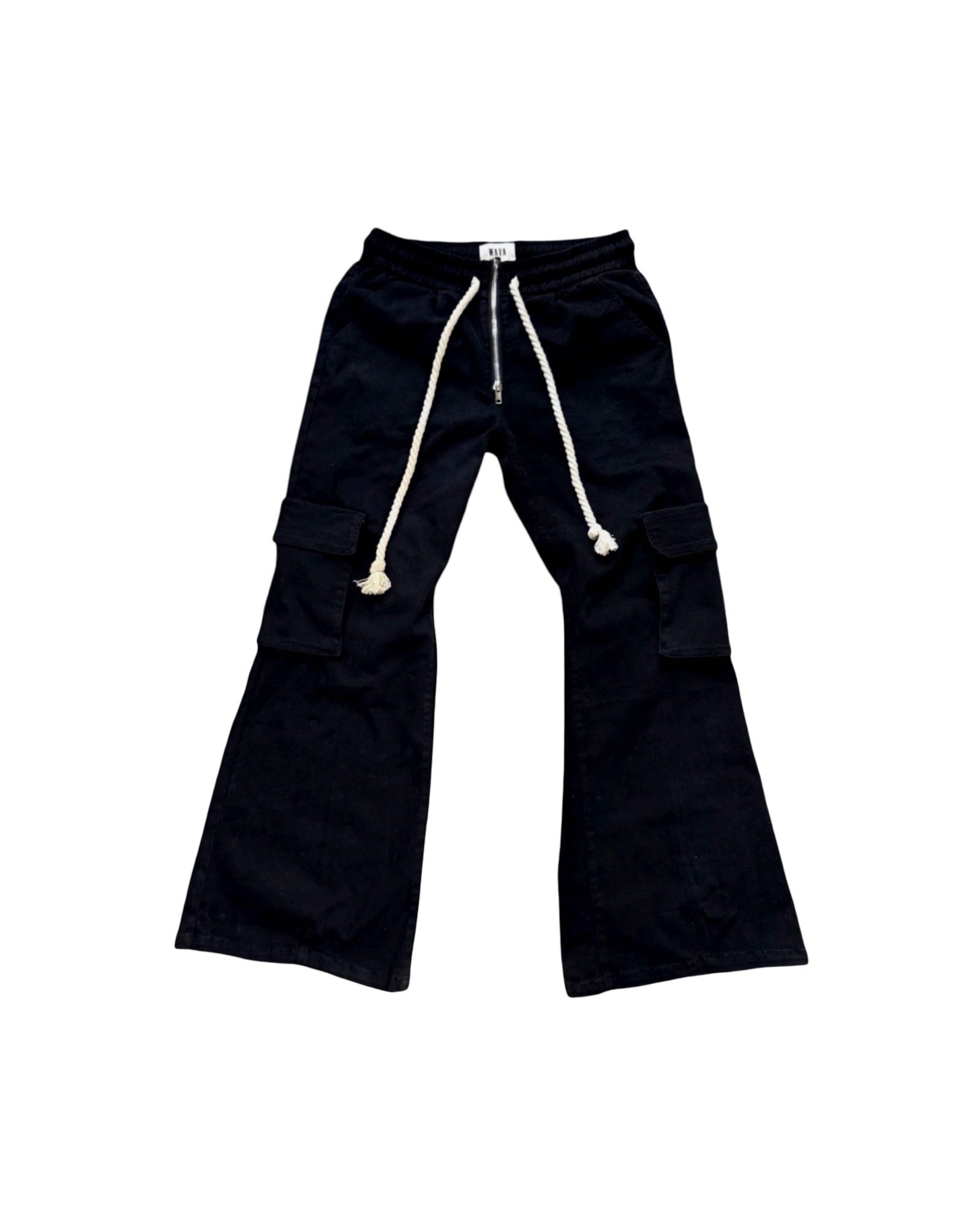 Nomad Cargo Pants are constructed from 360 GSM medium-weight cotton with slight stretch, offering structure with everyday mobility. Cut in a wide-leg silhouette with a subtle flare, the fit balances volume and movement while maintaining a clean line through the leg. Functional detailing includes removable button-snap cargo pockets, an elastic waistband with an 8mm rope drawstring, a chunky reverse zipper, and signature adjustable heel snaps designed to control heel drag based on footwear.